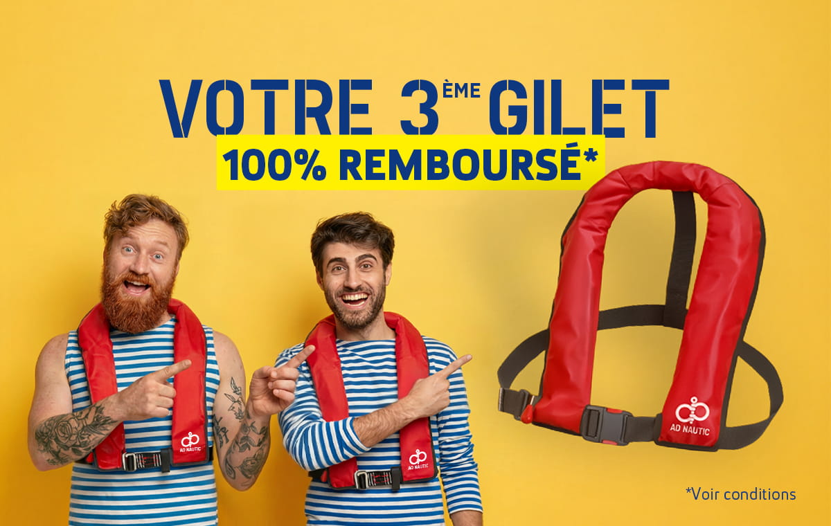 * Offre réservée aux clients disposant d’un compte AD NAUTIC. Les bons d’achats ne sont pas générés dans le cadre d’un achat des gilets en promotion ou lors d’un achat panaché sur les deux références ; ni pour les commandes passées en "mode invité" sur le site internet.